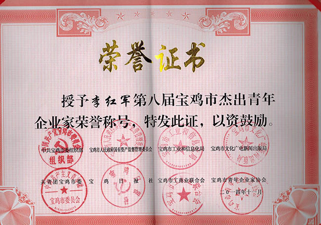 | 集團公司李董事長近日被寶雞市市委組織部、共青團寶雞市委、寶雞市人民政府國有資產監督管理委員會、寶雞市工業和信息化局、寶雞市文化廣電新聞出版局、寶雞日報社、寶雞市工商聯合會、寶雞市青年企業家協會聯合授予 :第八屆寶雞市杰出青年企業家榮譽稱號! |